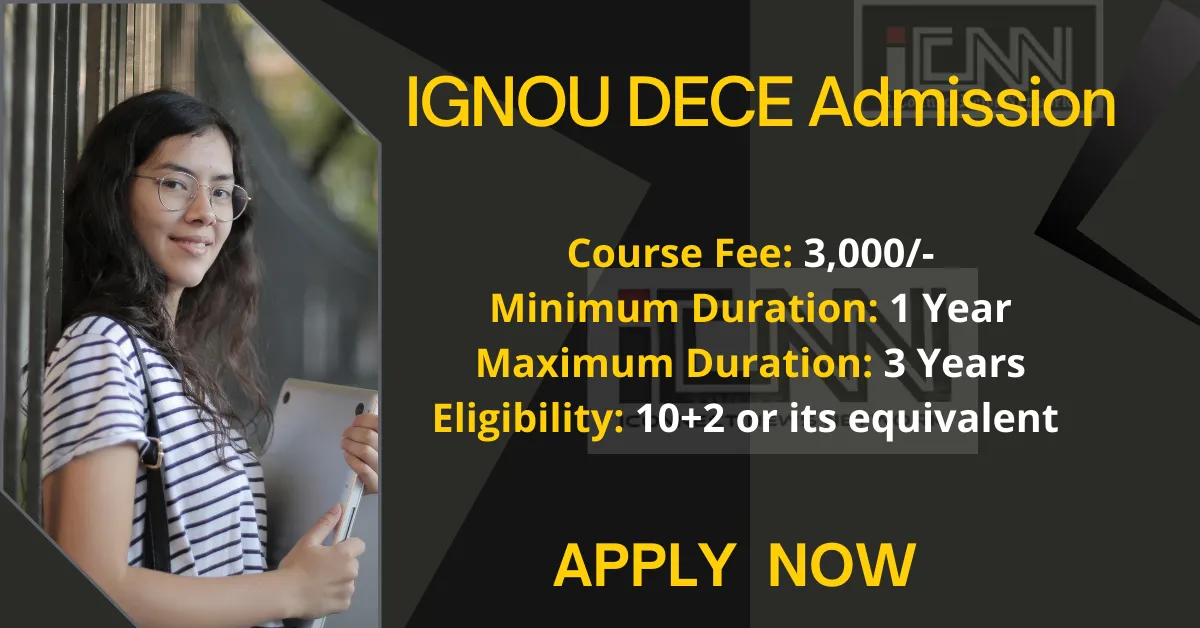 DECE full form is Diploma in Early Childhood Education programme. IGNOU ECCE course Admission 2025 course fees are INR 3,000. The Diploma in Early Childhood Care and Education program is a 1-year distance diploma course. The DECE course prepares students for preschools or daycare centres. They study subjects like Childhood Development, Health, Nutrition and Safety, Curriculum Planning, and Early Learning in Practice.