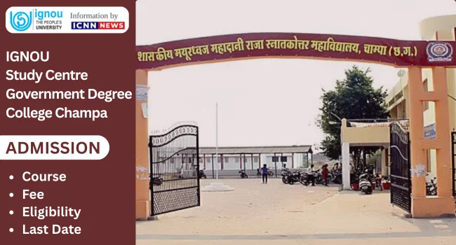 IGNOU Study Centre Government Degree College, Champa: Champa is also known as Mayoordhawaj Mahadani Raja Postgraduate College or Mayoordhawaj Mahadani Raja College. It was founded in 1972 in Champa, Bilaspur. A study centre affiliated with IGNOU is available at this college, which is under the regional centre in Raipur.