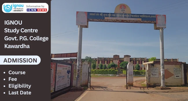 • IGNOU has started admission for the July 2025 Session for the IGNOU Study Centre, Govt. P.G. College Kawardha. Students can directly visit the IGNOU Study Centre for admission-related queries. Students can also fill out the Application form for career-related guidance.